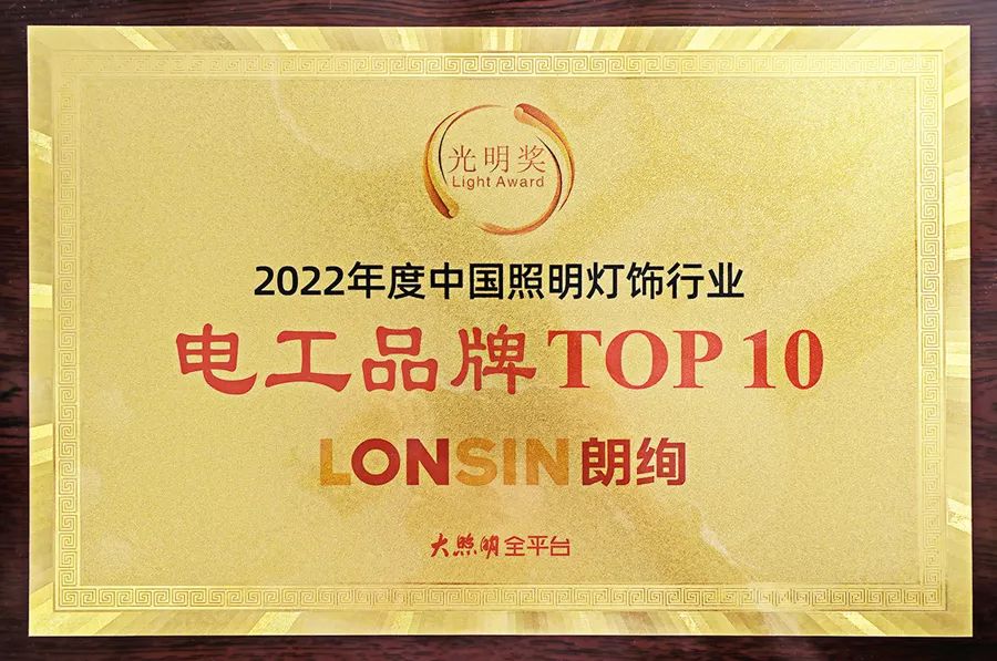 旗下電工品牌朗絢LONSIN,憑借良好的品牌形象,精細的生產(chǎn)工藝,持續(xù)的創(chuàng)新能力,獲得“2022‘光明獎’電工品牌TOP 10”榮譽稱號。