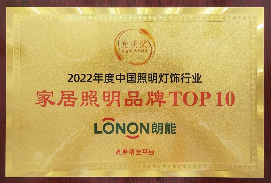 此次盛典大會,LONON照明憑借深厚的品牌底蘊,豐富的產(chǎn)品組合,可靠的產(chǎn)品質量,獲得“2022‘光明獎’家居照明品牌TOP 10”榮譽稱號。