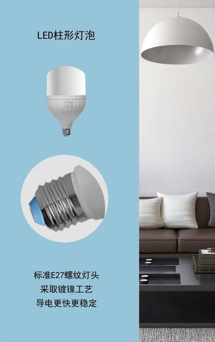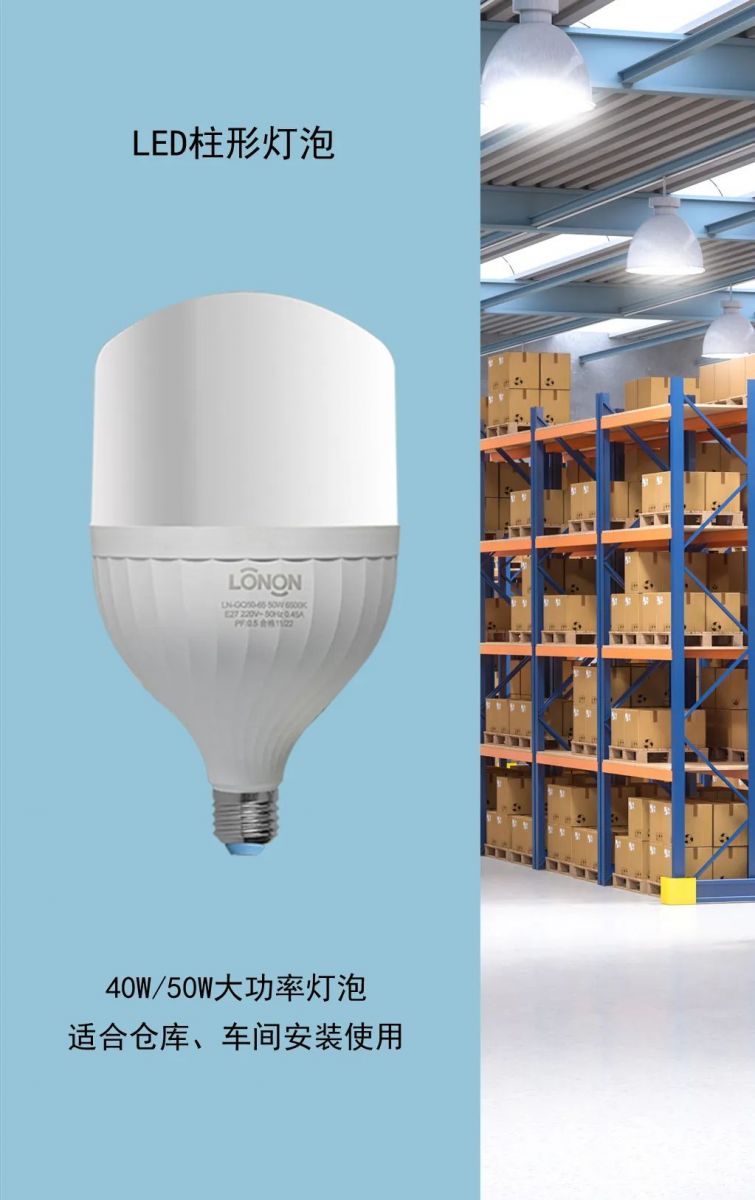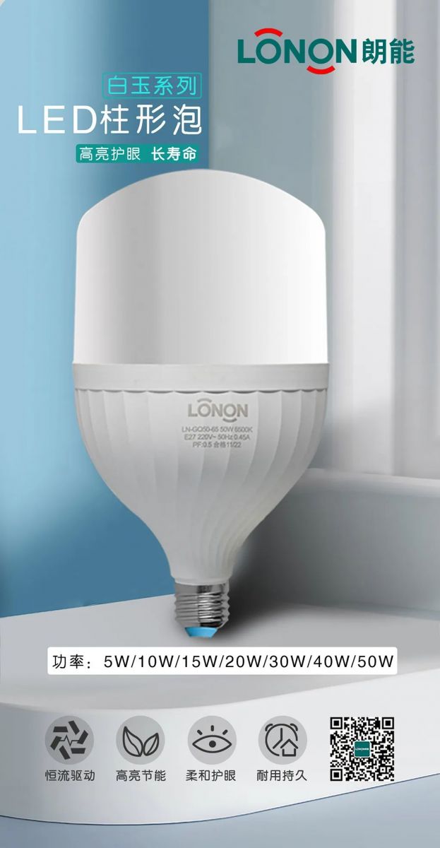 朗能LED柱形燈泡,產(chǎn)品規(guī)格齊全、多種功率選擇。 5W\10W\15W\20W\30W\40W\50W, 獨立安裝或配套吊燈、臺燈安裝使用,選擇多樣,應(yīng)用靈活,安裝便捷,家家戶戶都用得上!